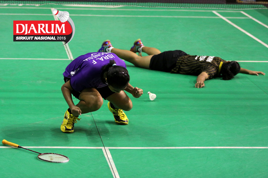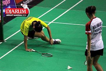 Aurum Oktavia (Jaya Raya) harus terjatuh saat berusaha mengembalikan shuttlecock