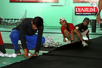 Dua pekerja saat memasang karpet di pinggir lapangan pertandingan
