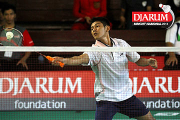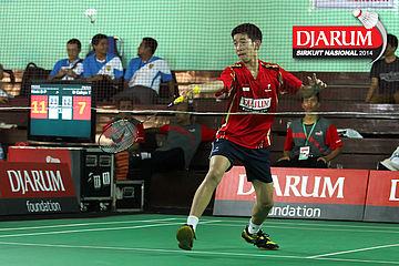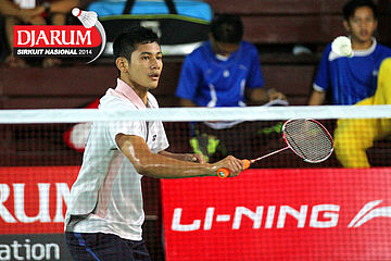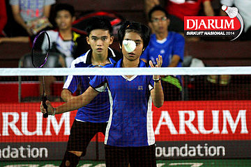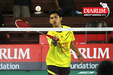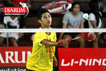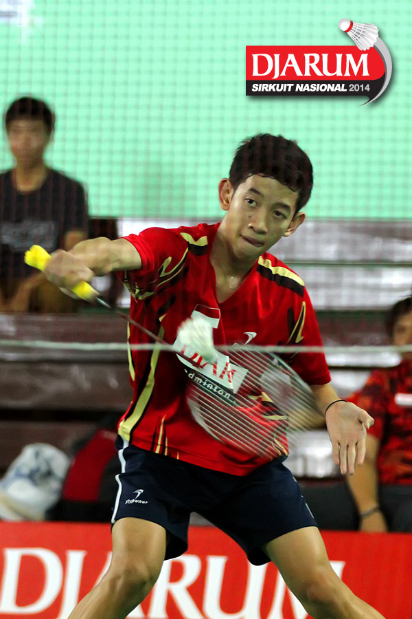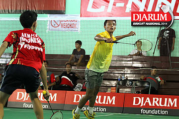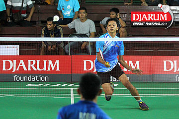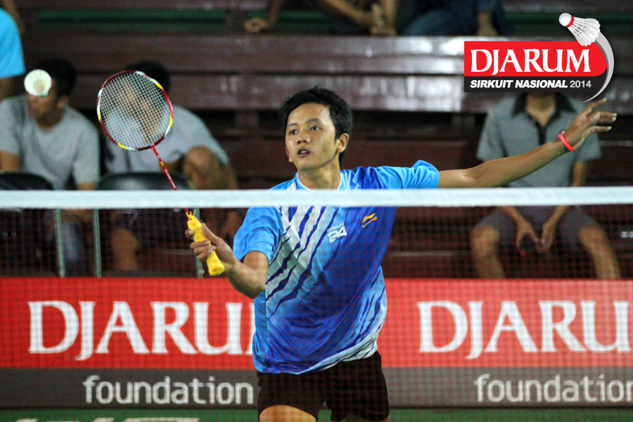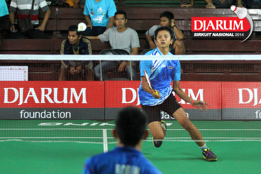 M. Ahdial Okta (Pelatprov PBSI DKI Jakarta) mengembalikan shuttlecock ke arah Reza (Murung Jaya)