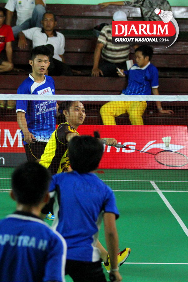 Hendra Tandjaya/Al Amelia Pramula (Hi Qua Wima) mengembalikan shuttlecock ke arah H. Saputra/Nadila (HSA Kaltim)