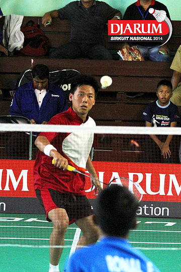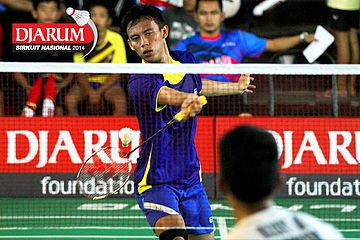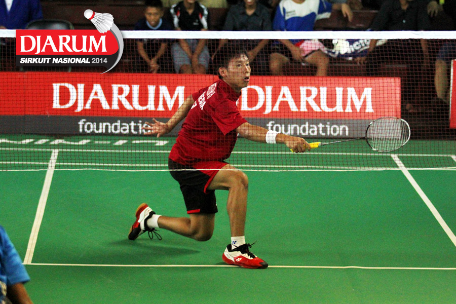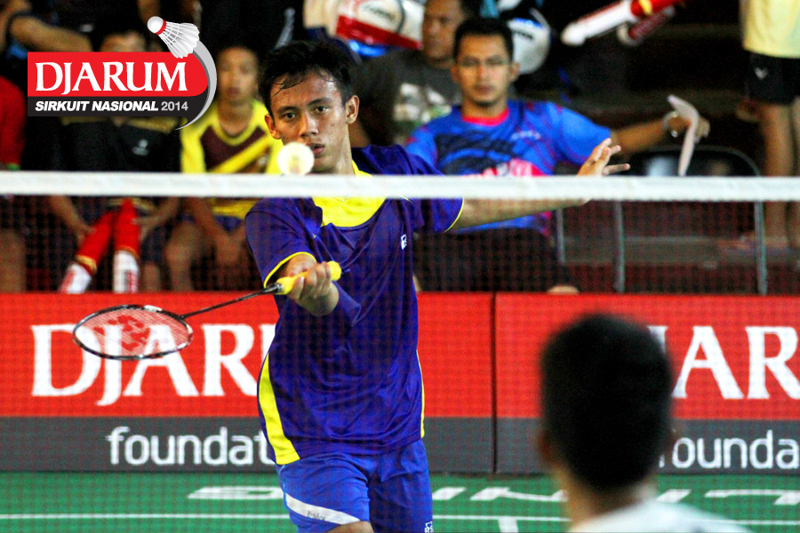 Christoven Howard (Candra Wijaya) mengembalikan shuttlecock ke arah Ronal Fajrin (IPC Jakarta)