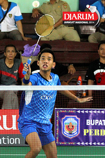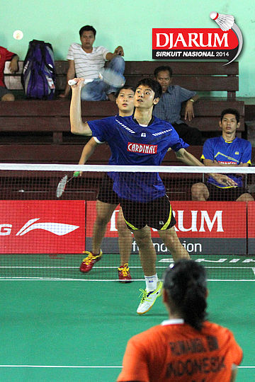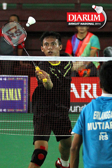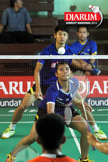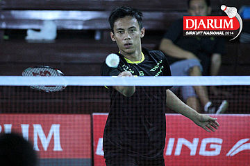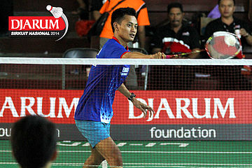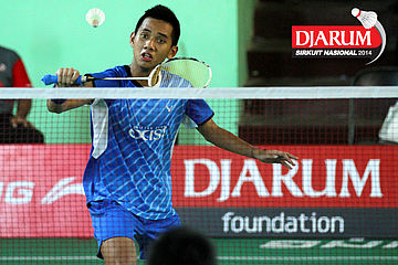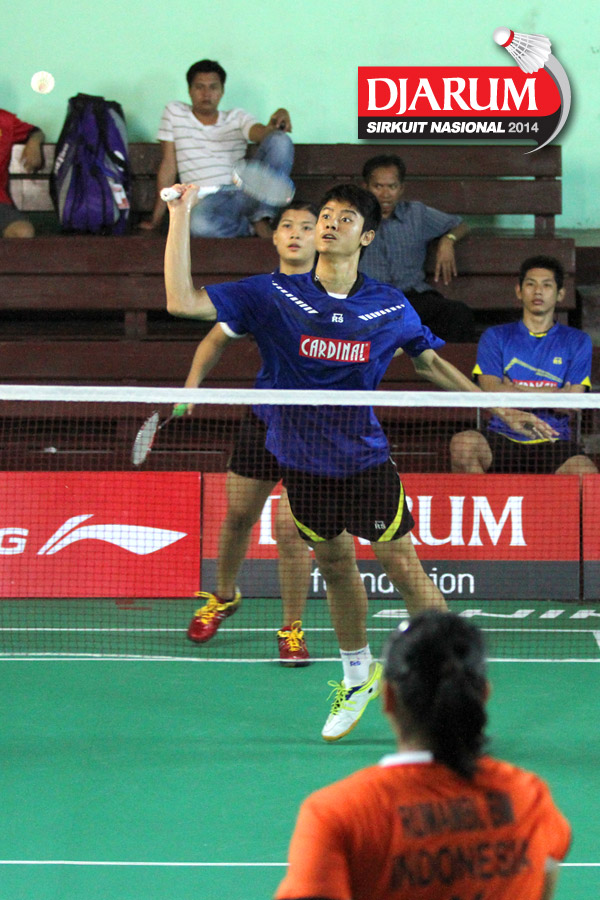 Nugroho Andi (JR Enkei) mengembalikan shuttlecock ke arah Christovel Karinda (Mentari V-Kool)