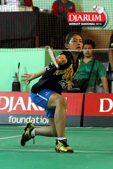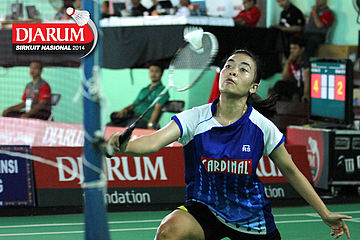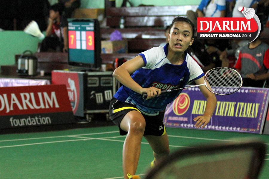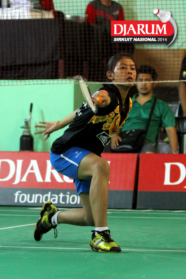 Linda Mutiara (Mutiara Bandung) mengembalikan shuttlecock ke arah Anita Maya (PPLP DKI Jakarta)