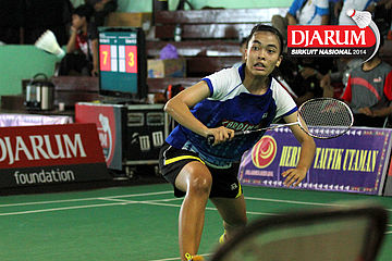Berlian Sudrajat (Semen Gresik) mengembalikan shuttlecock ke arah Erien Novita (FIFA BC)