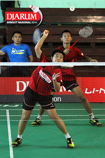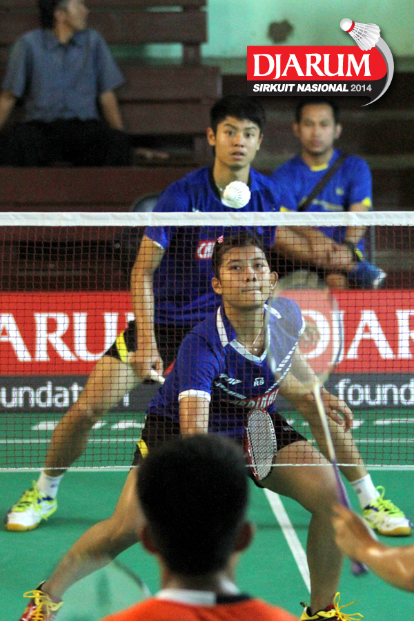 Galang Decky/Cynthia Shara (PB Djarum) menyambar pengembalian dari Fauzi Habibi/Apriyani Rahayu (Pelatprov PBSI DKI Jakarta)