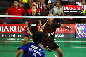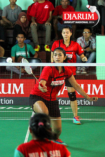 Rofahadah Supriadi/Syafitri Nur Azizah (PB Djarum) bersiap menyambut pengembalian dari Nisak Puji/Rika Rositawati (Mutiara Bandung)