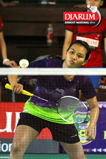 Deariska Putri/Nurbeta Kwanrico (PB Djarum) menyambut pengembalian dari Natalia Poluakan/Sri Wulan (Tangkas/Jaya Raya)