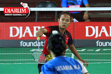 Evert Sukamta (Tangkas) bersiap mengembalikan shuttlecock ke arah Alamsyah Yunus (JR Enkei)