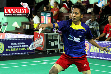 Rena Suwarno (Jaya Raya) mengembalikan shuttlecock ke arah Sesaria (Bintang Perkasa)