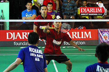 Akbar Bintang/Jeka Wiratama (PB Djarum) mengembalikan shuttlecock ke arah Krishna Adi/Richard Kuncoro (Jaya Raya Suryanaga)
