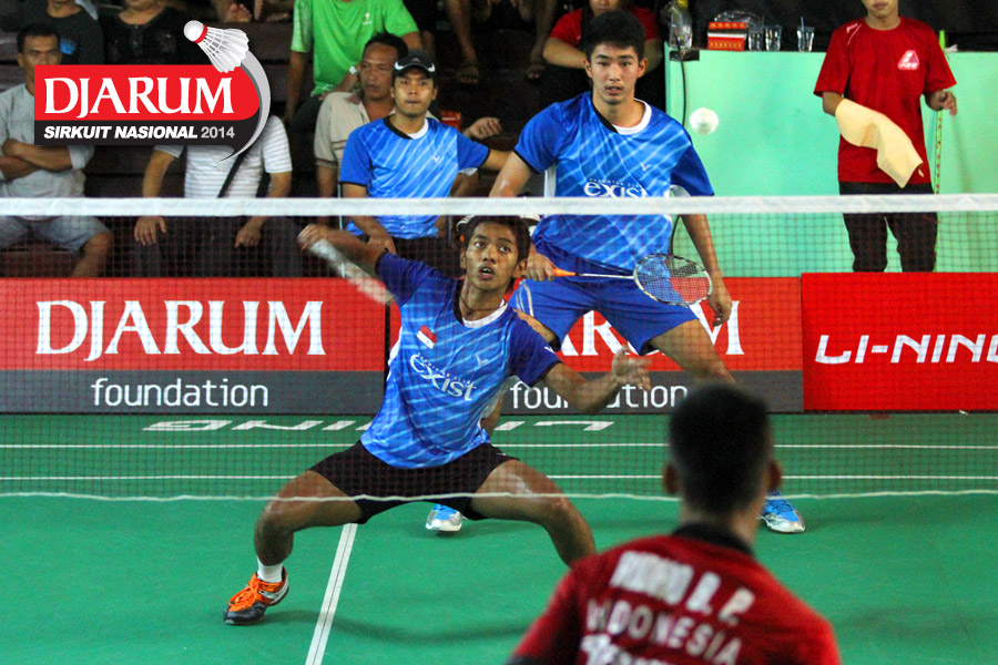 Alwi Mahardika/Felix Eka (Exist) mengembalikan shuttlecock ke arah Galang Decky/Ridho Bianto (PB Djarum)