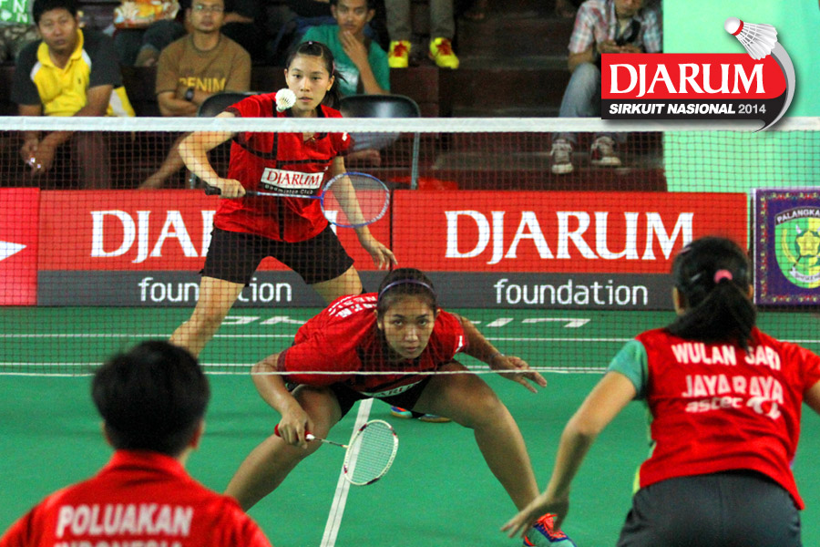 Deariska Putri/Nurbeta Kwanrico (PB Djarum) bersiap menghadang pengembalian dari Natalia Poluakan/Sri Wulan (Tangkas/Jaya Raya)