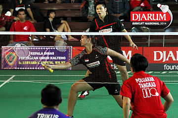 Kenas Adi/Jenna Gozali (PB Djarum) berhasil mengembalikan shuttlecock ke arah Anggun Nugroho/Dian Fitriani (Halim/Pertamina)