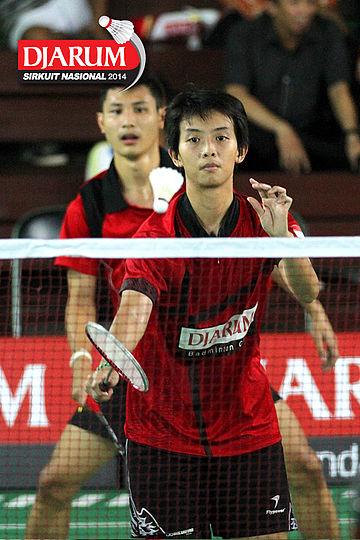 Kenas Adi/Jenna Gozali (PB Djarum) melepaskan serve