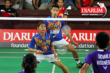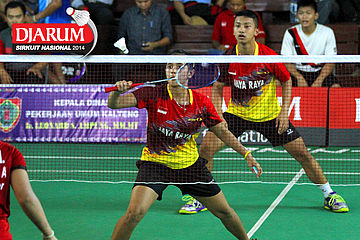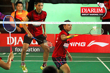 M. Reza Fahlepi/Zarra Faza (Jaya Raya) bersiap mengembalikan shuttlecock ke arah Feisal Wiranto/Tutut Novi (PB Djarum)