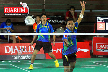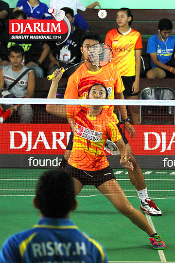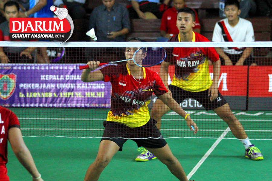 Feisal Wiranto/Tutut Novi (PB Djarum) mengembalikan shuttlecock ke arah M. Reza Fahlepi/Zarra Faza (Jaya Raya)