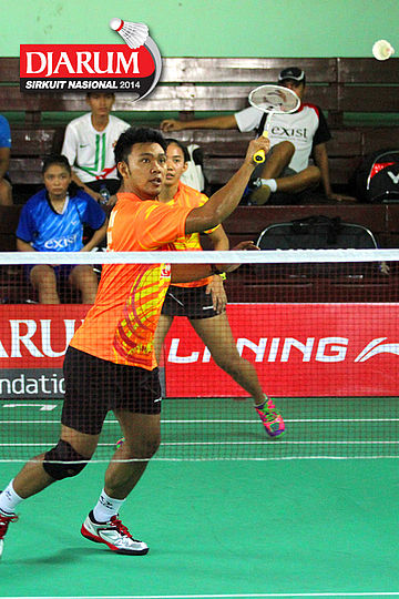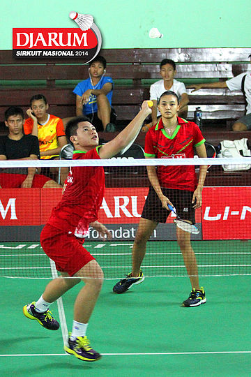 Ragawa Tamasuta/Berlian Sudrajat (Semen Gresik) bersiap menyambut pengembalian dari Giovani Dicky/Brigita Marcelia (Exist)