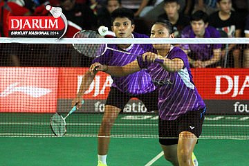 Anggun Nuggroho/Dian Fitriani (Halim/Pertamina) bersiap menyambut pengembalian dari Trikus Haryanto/Natalia Poluakan (Tjakrindo Masters/Tangkas)