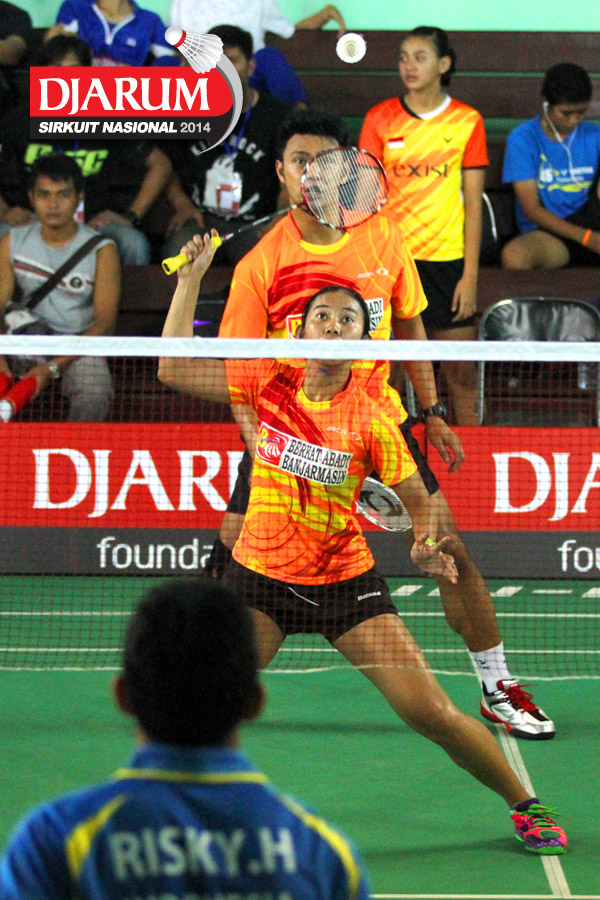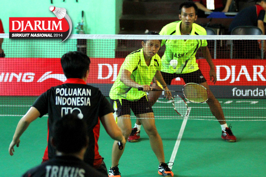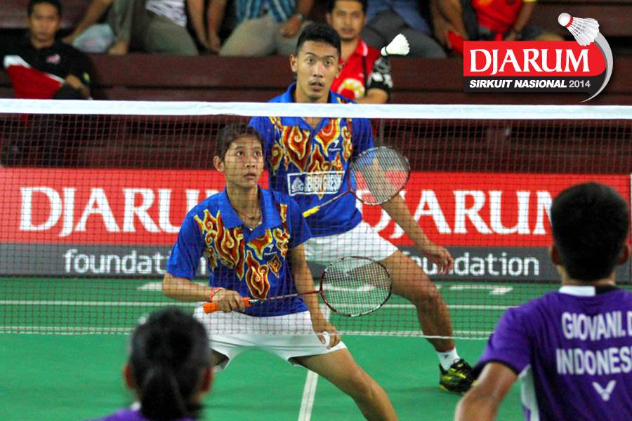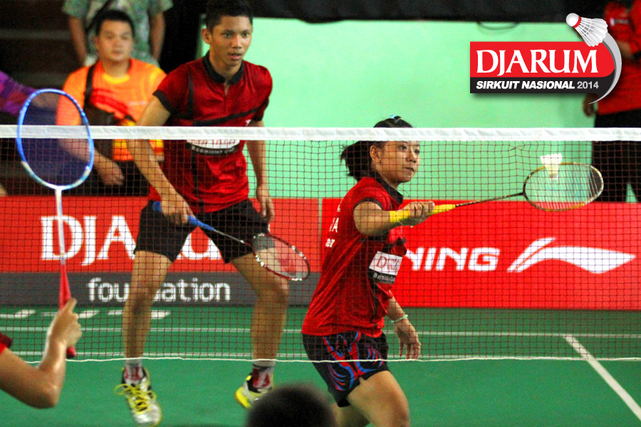Giovani Dicky/Brigita Marcelia (Exist) menyambut serve dari Ragawa Tamasuta/Berlian Sudrajat (Semen Gresik)