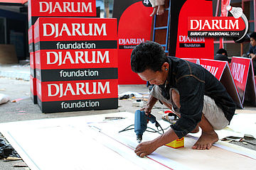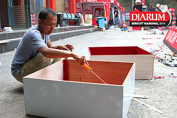 Salah satu pekerja sedang memaku rangka ads board Djarum Foundation.