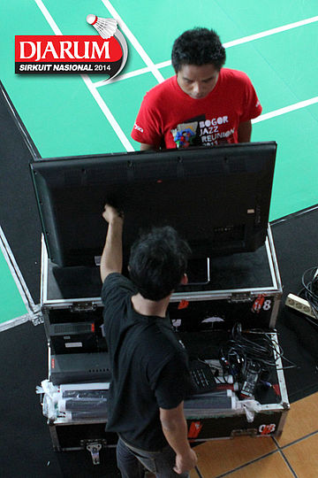 Dua pekerja saat merapihkan tempelan Djarum Foundation di kursi wasit.