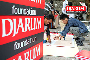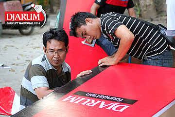 Beberapa pekerja saat memasang ads board Djarum Foundation.