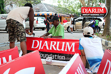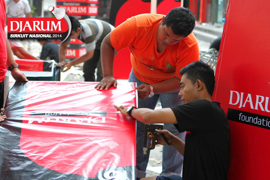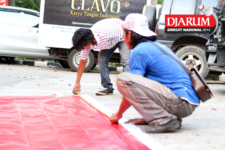Dua pekerja saat membuka lipatan giant banner Djarum Sirkuit Nasional 2014.