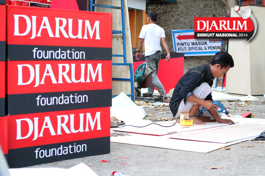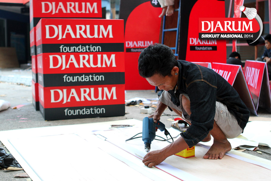 Seorang pekerja sedang memasang ads board Djarum Foundation.