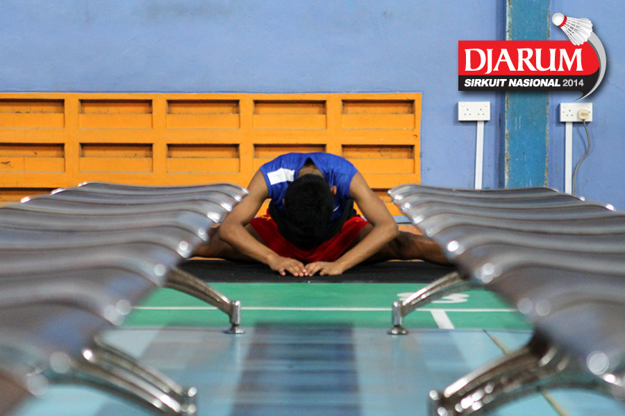 Salah satu atlet saat melakukan peregangan sebelum memulai latihan di GOR Banda Baru, Batam.