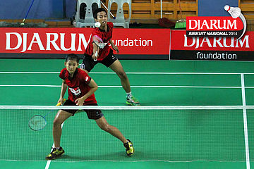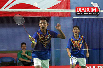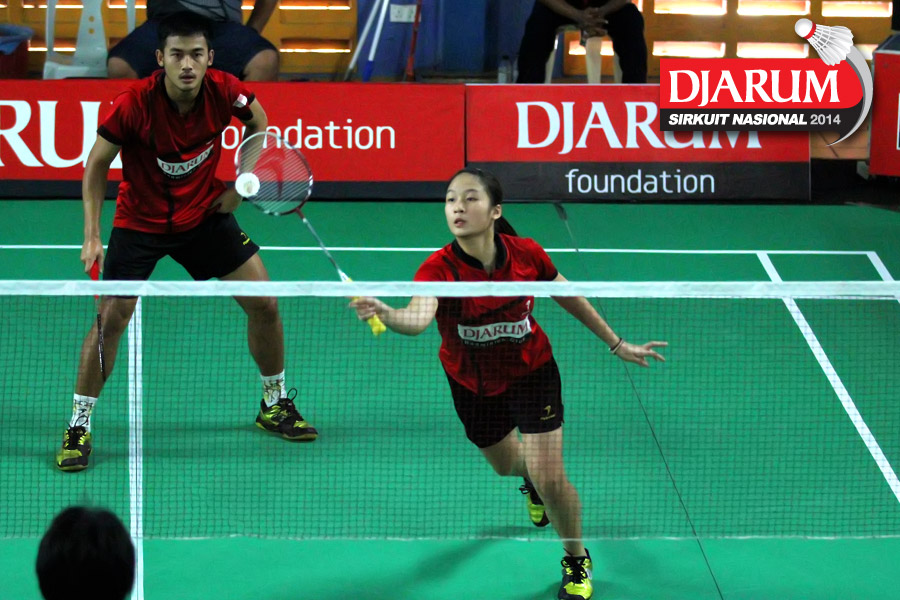 Ridho Bianto/Rahmadhani Hestiyanti (PB Djarum) mengembalikan shuttlecock ke arah Anbiya Bramasta/Bunga Fitriani (Mutiara Bandung).
