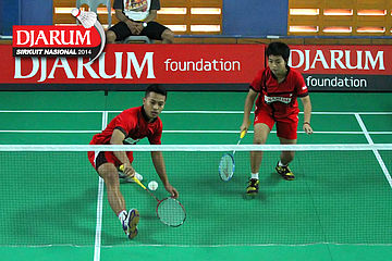 Ragawa Tamasuta/Berlian Sudrajat (Semen Gresik) mengembalikan shuttlecock ke arah M. Aria Wijaya/Monica Nggiu (Mutiara Bandung).