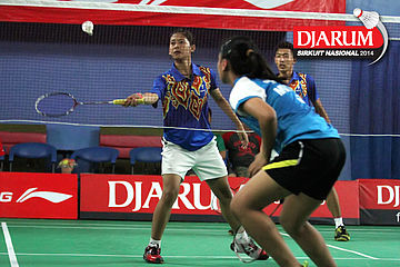 Angger Sudrajat/Felicia Parmenas (PB Djarum) menyambut serve dari Fachriza Abimanyu/Lya Ersalita (Jaya Raya).