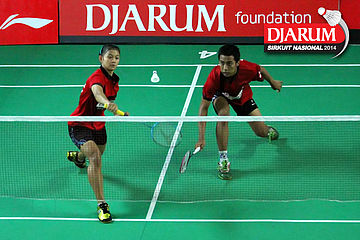 Kuncoro/Meirisa Cindy (Jaya Raya Suryanaga) bersiap menyambut pengembalian dari Vicky Rizky/Rofahadah Supriadi (PB Djarum).