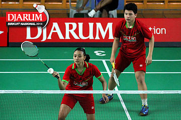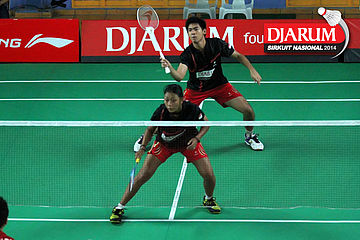 Vicky Rizky/Rofahadah Supriadi (PB Djarum) bersiap menyambut pengembalian dari Richard Kuncoro/Meirisa Cindy (Jaya Raya Suryanaga).