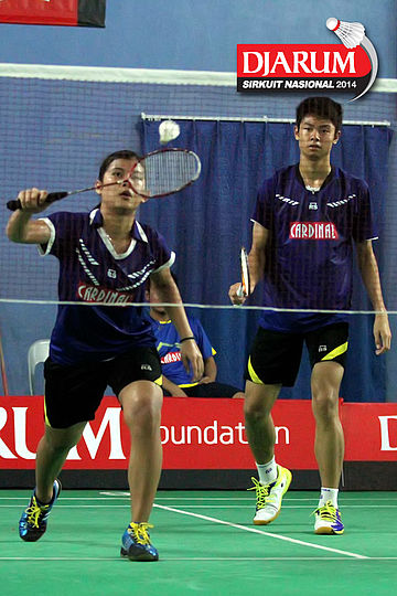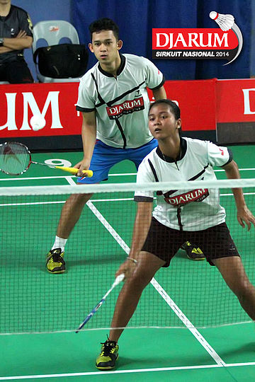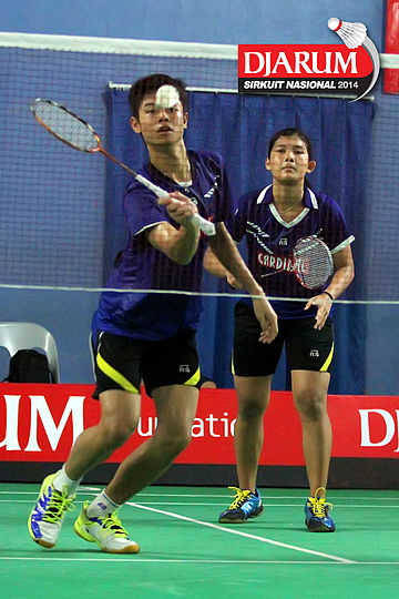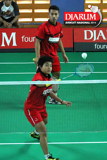 Yahya Adi/Cynthia Shara (PB Djarum) mengembalikan shuttlecock ke arah Wahyu Hariyansyah/Novi Darmayanti (Chandra Wijaya).