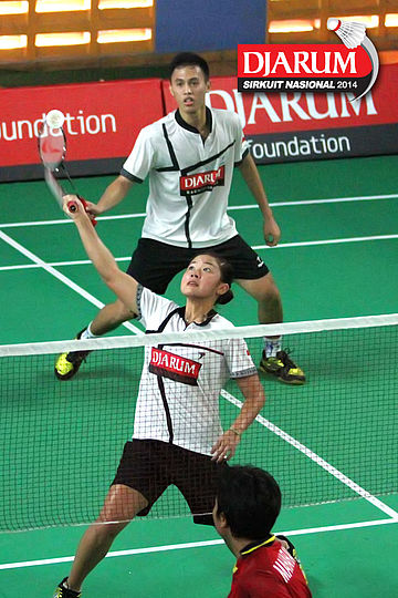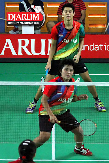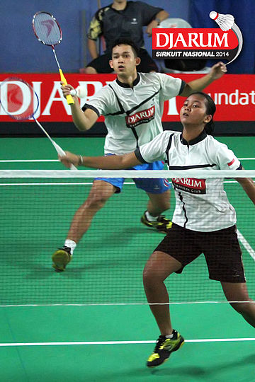 Tedi Supriadi/Jessica Shohan (PB Djarum) menyambar pengembalian tanggung dari Komadani Maytri/Anggi Maharani (Jaya Raya Suryanaga)