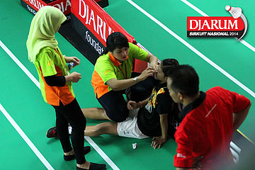 Pemain tunggal taruna putri Semen Gresik, Berlian Sudrajat (dua dari kanan) saat menerima penanganan medis.
