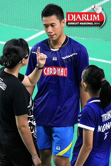 Pemain ganda campuran taruna Mutiara Bandung, Anbiya Bramasta/Bunga Fitriani saat mendapatkan pengarahan dari pelatih.