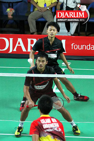Akbar Bintang/Angger Sudrajat (PB Djarum) bersiap menyambut pengembalian dari pasangan Danang Dwi/Ridho Islami (Jaya Raya).