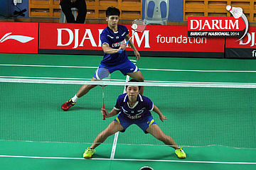 Richard Kuncoro/Meirisa Cindy (Jaya Raya Suryanaga) bersiap menghadang pengembalian dari Achmad Fasich/Tays Rona (Citra Raya Unesa).