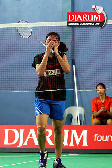 Ekspresi bersyukur Yeni Asmarani (PB Djarum) setelah berhasil memastikan diri ke partai final usai mengalahkan Tieke Arieda (Jaya Raya Suryanaga).