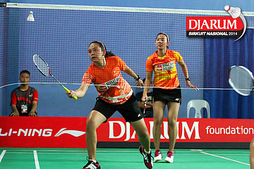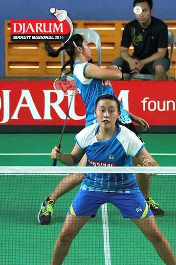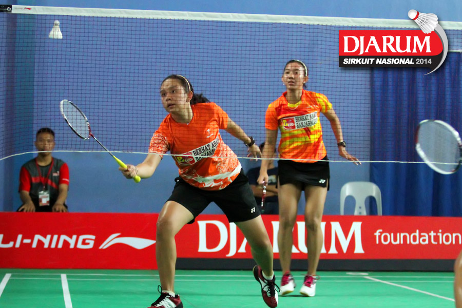 Devi Tika Permatasari/Keshya Nurvita Hanadia (SGS PLN) mengembalikan shuttlecock ke arah Aris Budiharti/Ery Oktaviani (Jaya Raya).