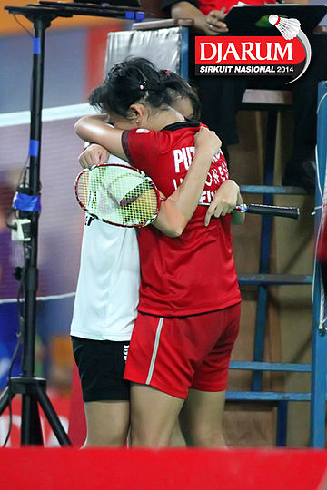 Dua pebulutangkis tunggal remaja putri PB Djarum, Putri Ayu (Merah) dan Silvi Wulandari saling berpelukan usai keduanya bertanding memperebutkan tiket final.
