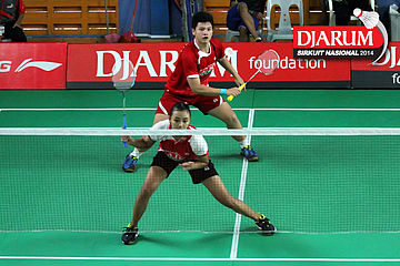 Ryan Saoqi/Jovita Evani (Mutiara Bandung) mengembalikan shuttlecock ke arah Ardiansyah Putra/Devi Tika Permatasari (Berkah Abadi Banjarmasin).