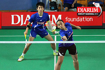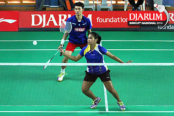 Rizky Hidayat/Nadya Melati (Hi Qua Wima/Pertamina Indonesia) bersiap menyambar pengembalian dari Ricky Alverino/Ristya Ayu (PB Djarum).