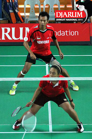 Anggun Nugroho/Keshya Nurvita Hanadia (Halim/SGS PLN) bersiap menyambut pengembalian dari Stefan Indra/Aris Budiharti (Mutiara Bandung/Jaya Raya).