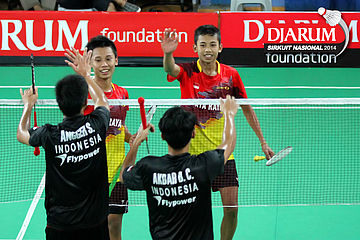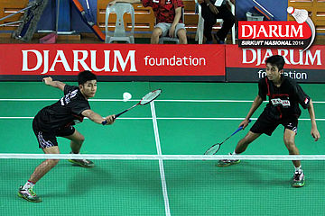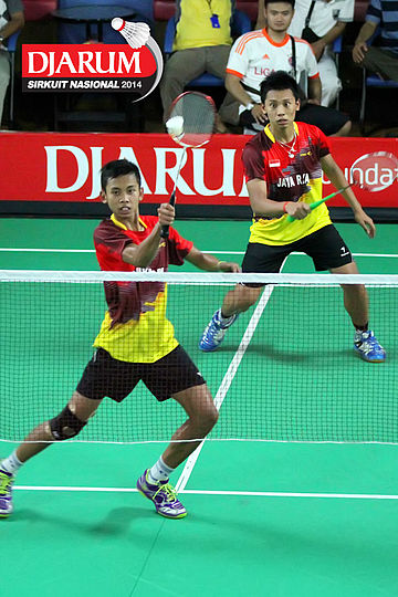 Danang Dwi/Ridho Islami (Jaya Raya) menyambar pengembalian dari Akbar Bintang/Angger Sudrajat (PB Djarum).