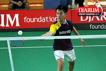 Fauzi Adnan (Jaya Raya Suryanaga) melepaskan serve.