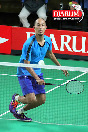 Nugroho Andi (JR Enkei) mengembalikan shuttlecock ke arah Senatria Agus (SGS PLN).