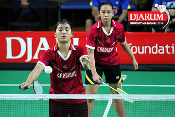 Dianita Saraswati/Yulfira Barkah (Mutiara Bandung) melakukan serve.